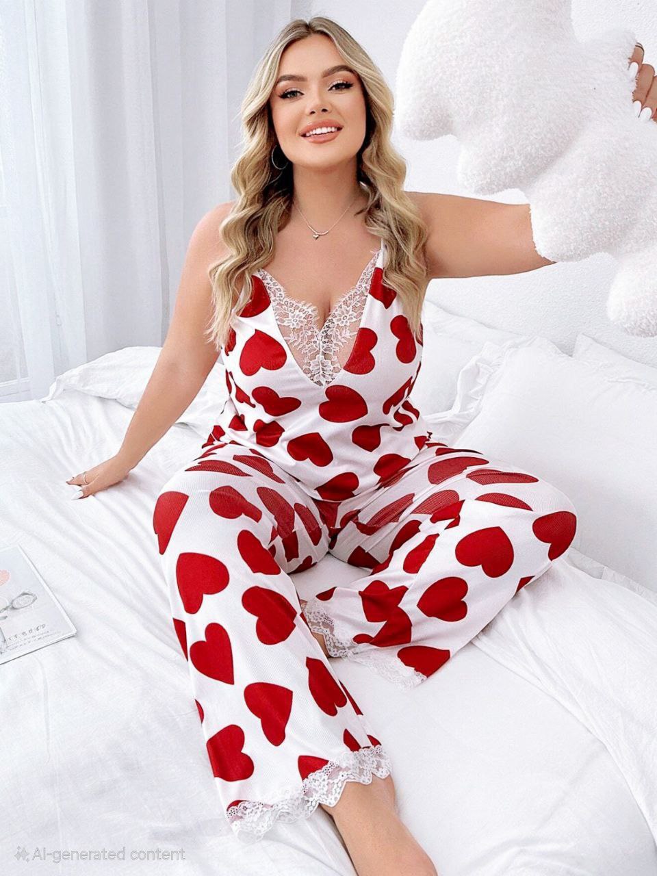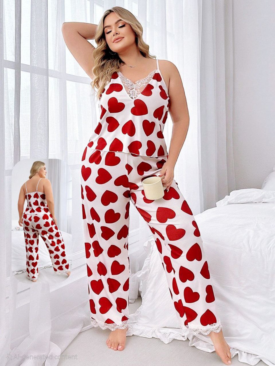 توب حمالات أبيض بفتحة V مزينة بدانتيل شيك، ومعاه بنطلون واسع نفس طباعة القلوب الحمراء ❤️.