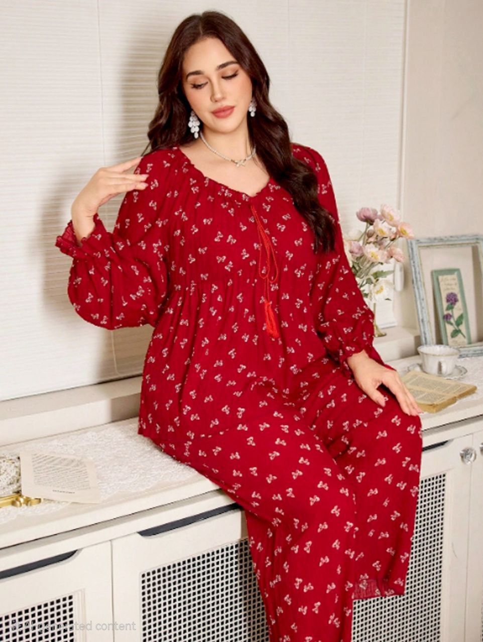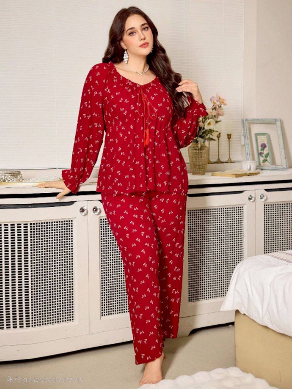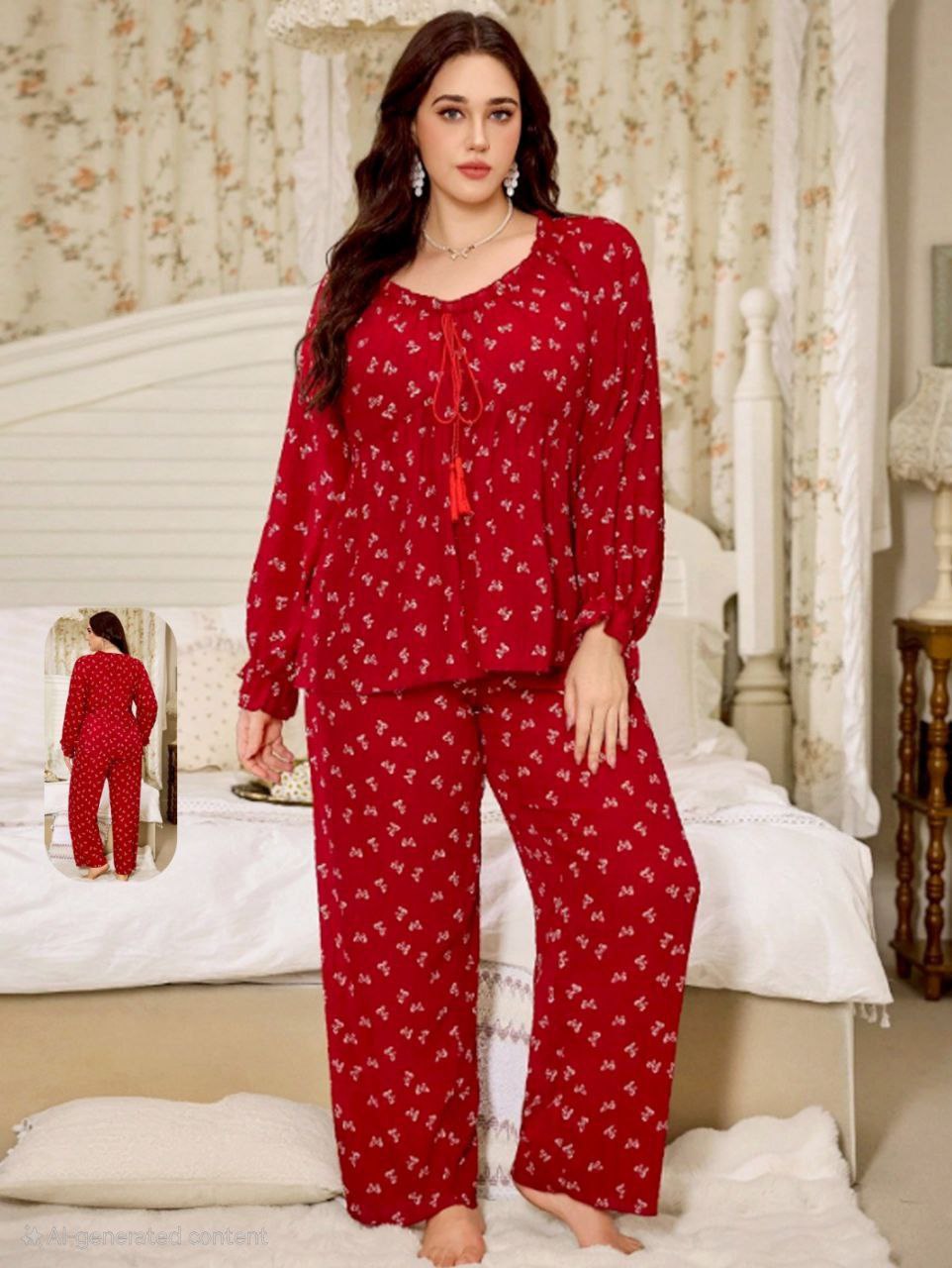 طقم بيجامة/لاونج وير خريفي بيج سايز من إيزابيلا: توب أحمر واسع بنقشة فيونكات صغيرة، بفتحة رقبة برباط شرّابات وكُمّين مطاط، ومعاه بنطلون واسع بنفس النقشة… لوك أنثوي شيك ومريح للبيت والقعدة مع العيلة 🧡
