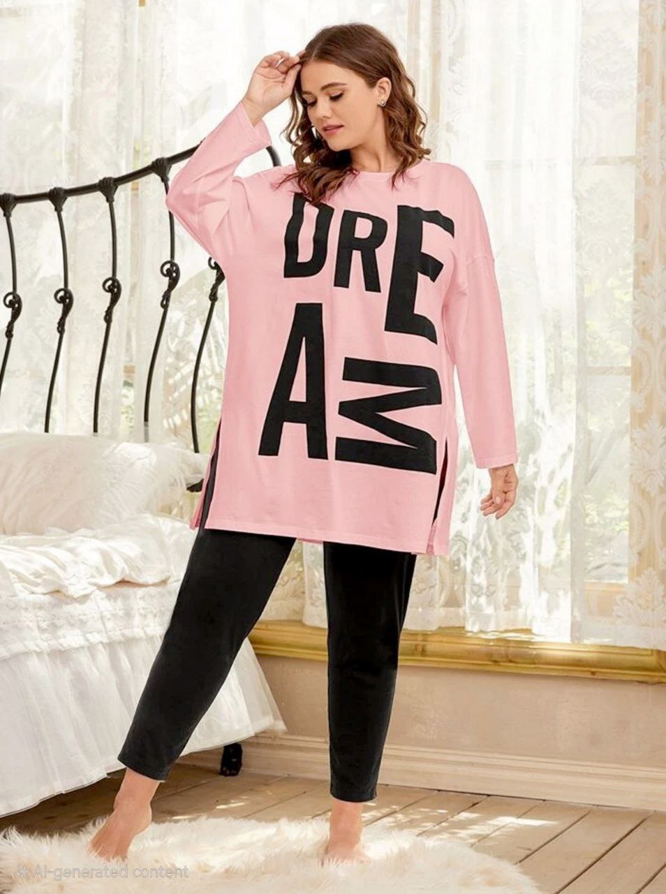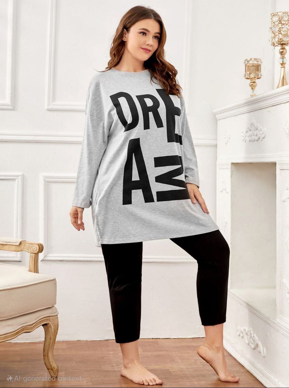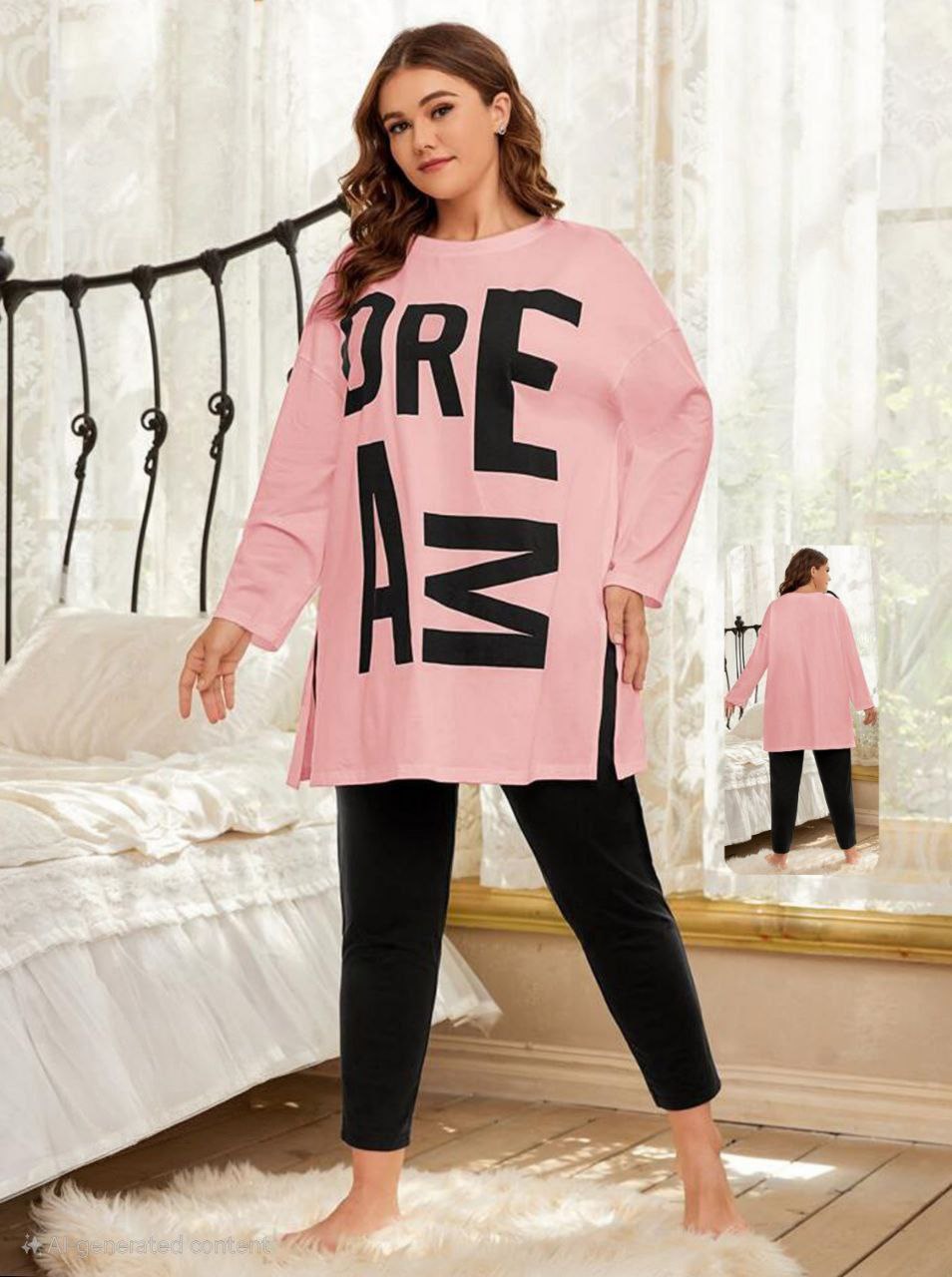 طقم بيجامة خريفي بيج سايز من إيزابيلا: تونيك طويل مطبوع كلمة “DREAM” بحروف كبيرة مع فتحات جانبية للحركة، وبنطلون أسود مريح بوسط مطاطي 👚👖