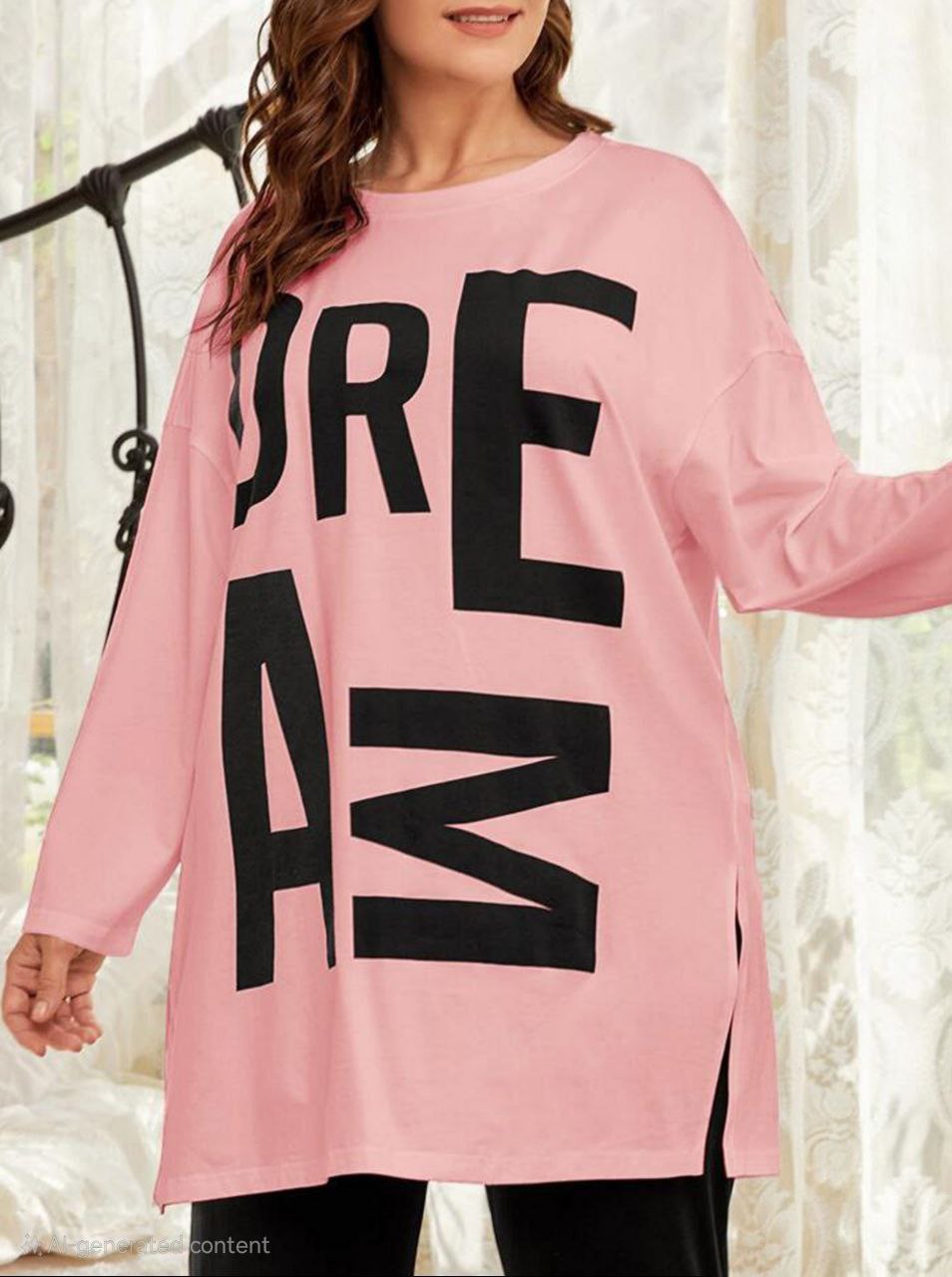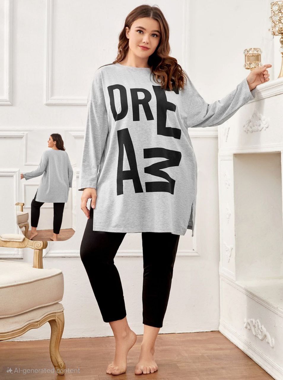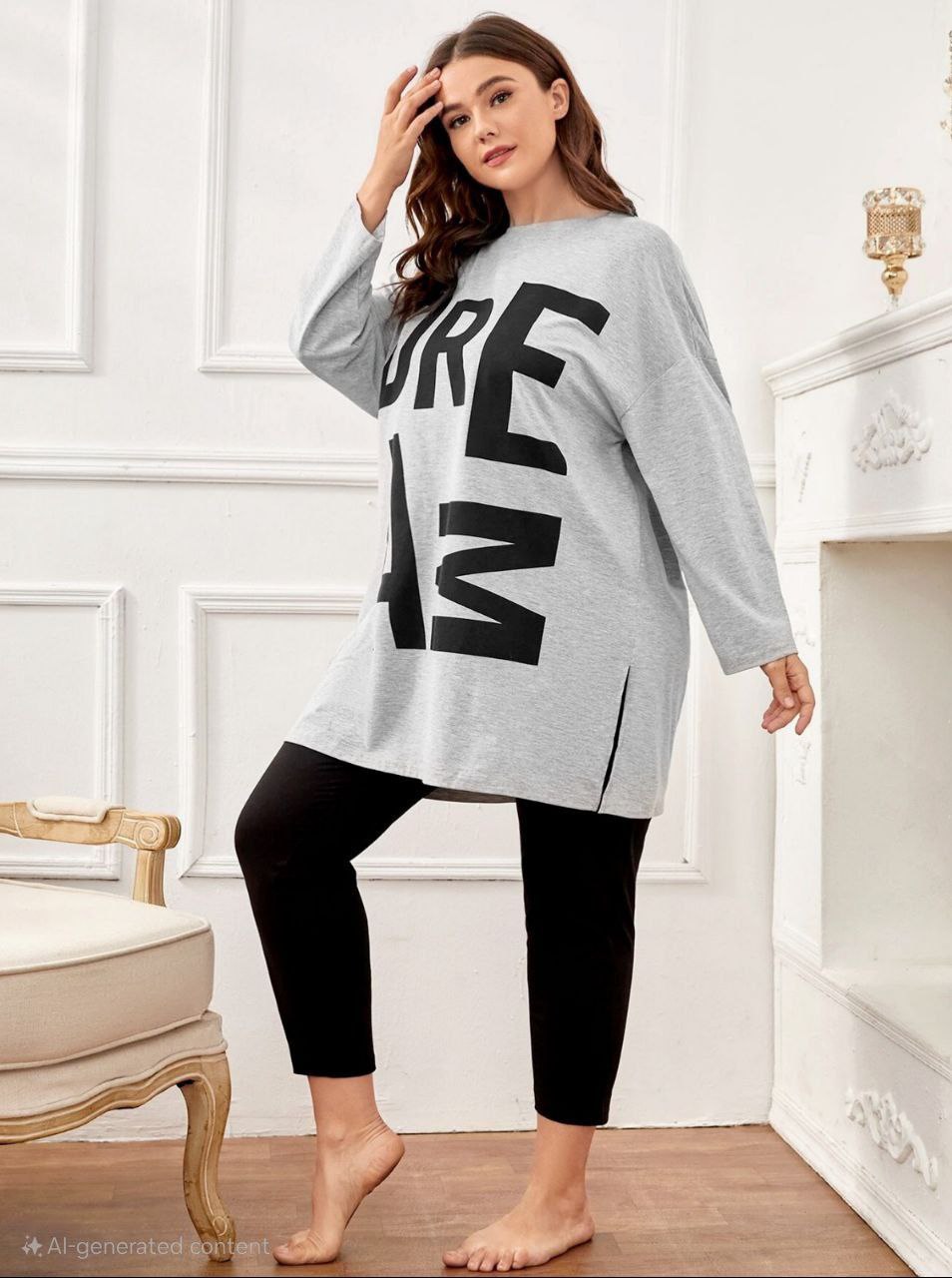 طقم بيجامة خريفي بيج سايز من إيزابيلا: تونيك طويل مطبوع كلمة “DREAM” بحروف كبيرة مع فتحات جانبية للحركة، وبنطلون أسود مريح بوسط مطاطي 👚👖