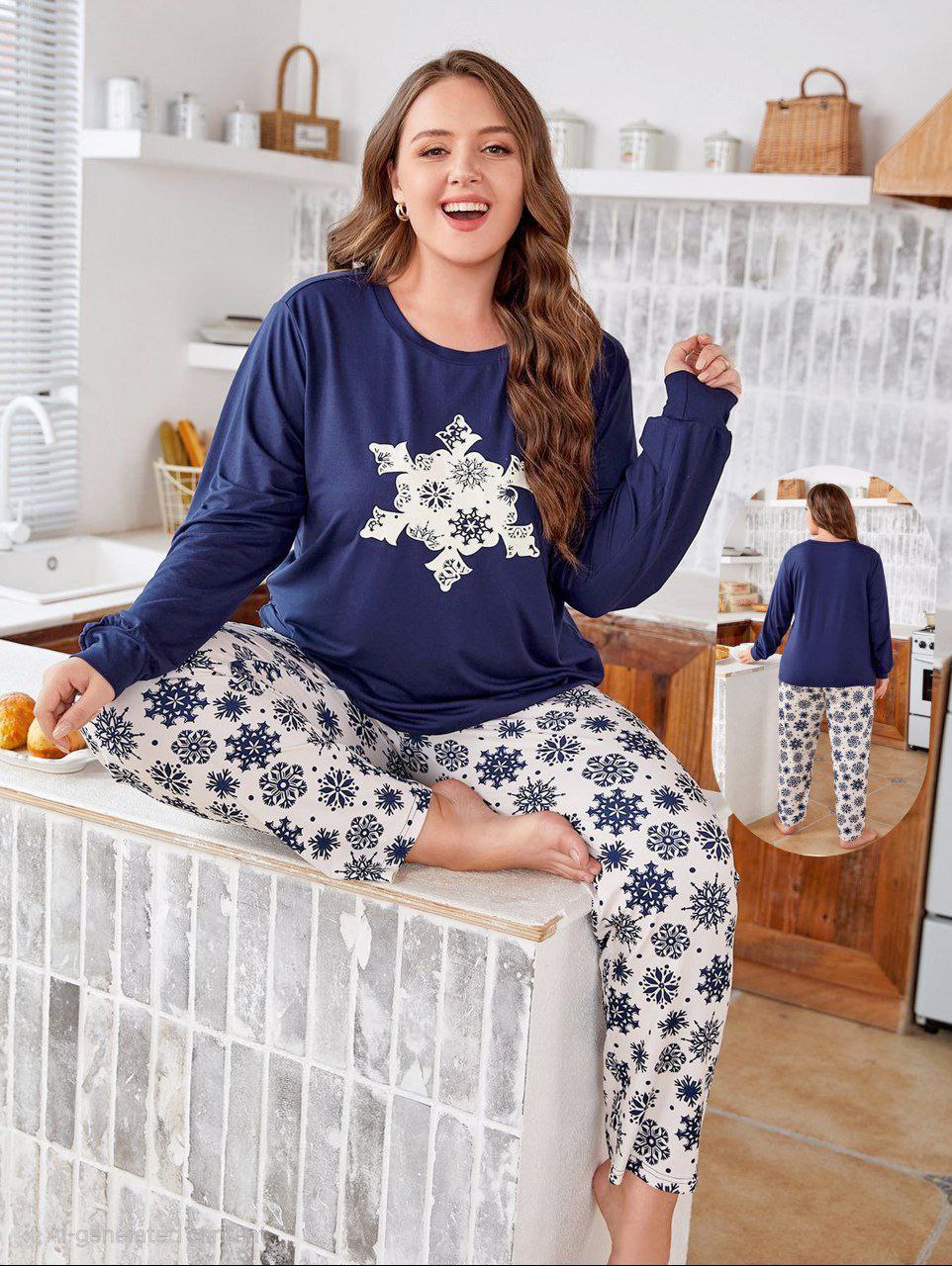 لو بتدوري على بيجامة خريفي قطن بيج سايز كحلي × أوف وايت بنقشة سنو فليك عملية وشيك، إيزابيلا هتليق عليكِ وهتديكي راحة وأناقة في نفس الوقت 💖🌿