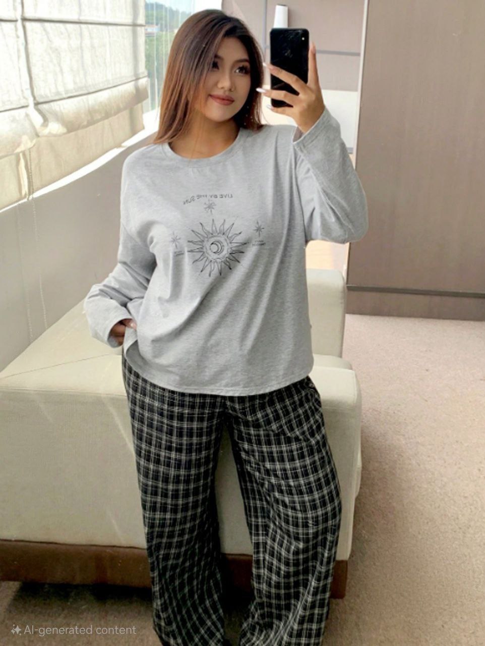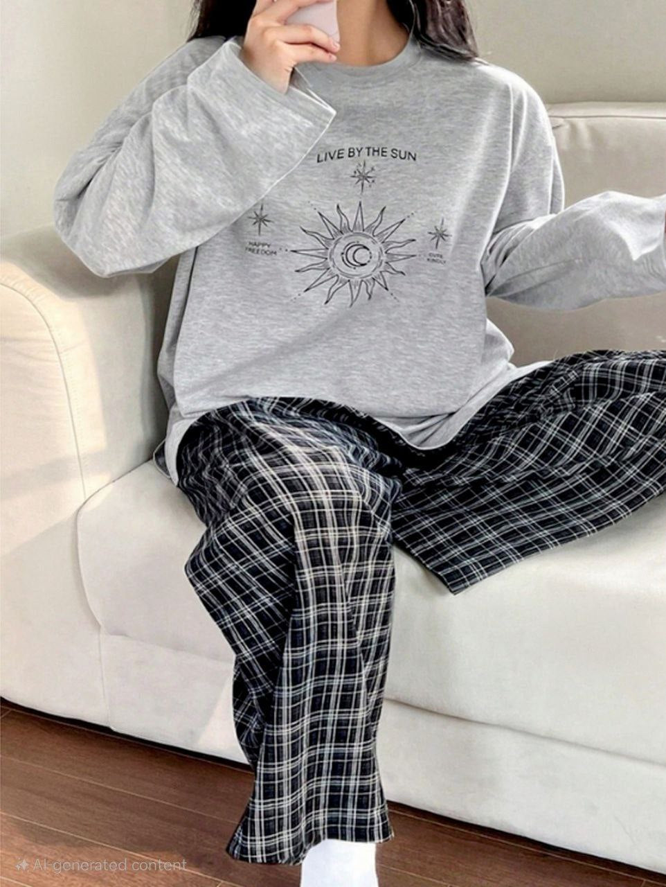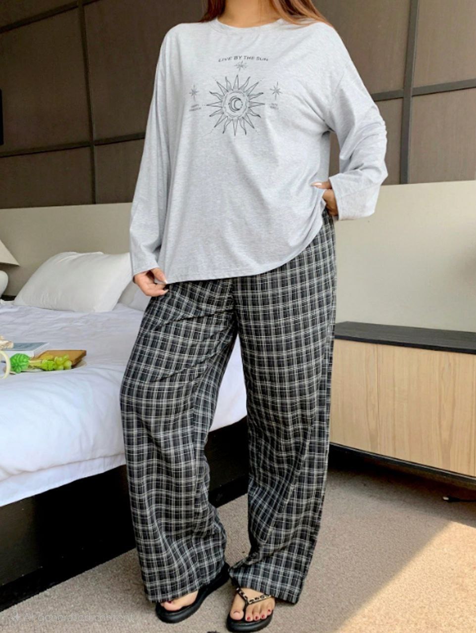 طقم بيجامة خريفي بيج سايز من إيزابيلا: تي-شيرت رمادي ميلانج بأكمام طويلة بطبعة شمس وقمر LIVE BY THE SUN، ومعاه بنطلون كاروهات واسع درجات رمادي × أسود شيك جدًا 🖤🌙