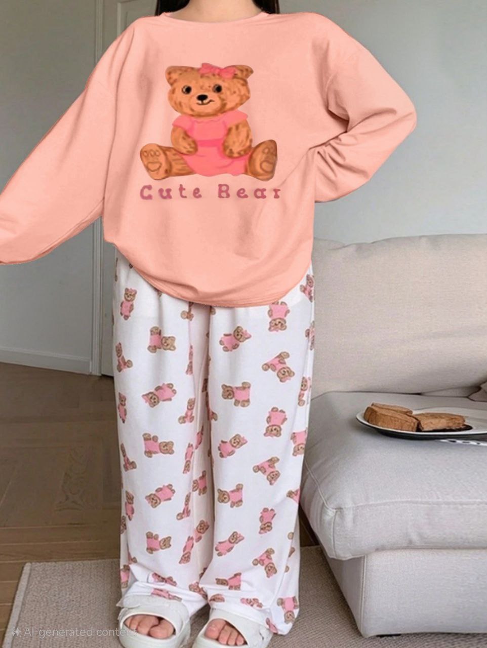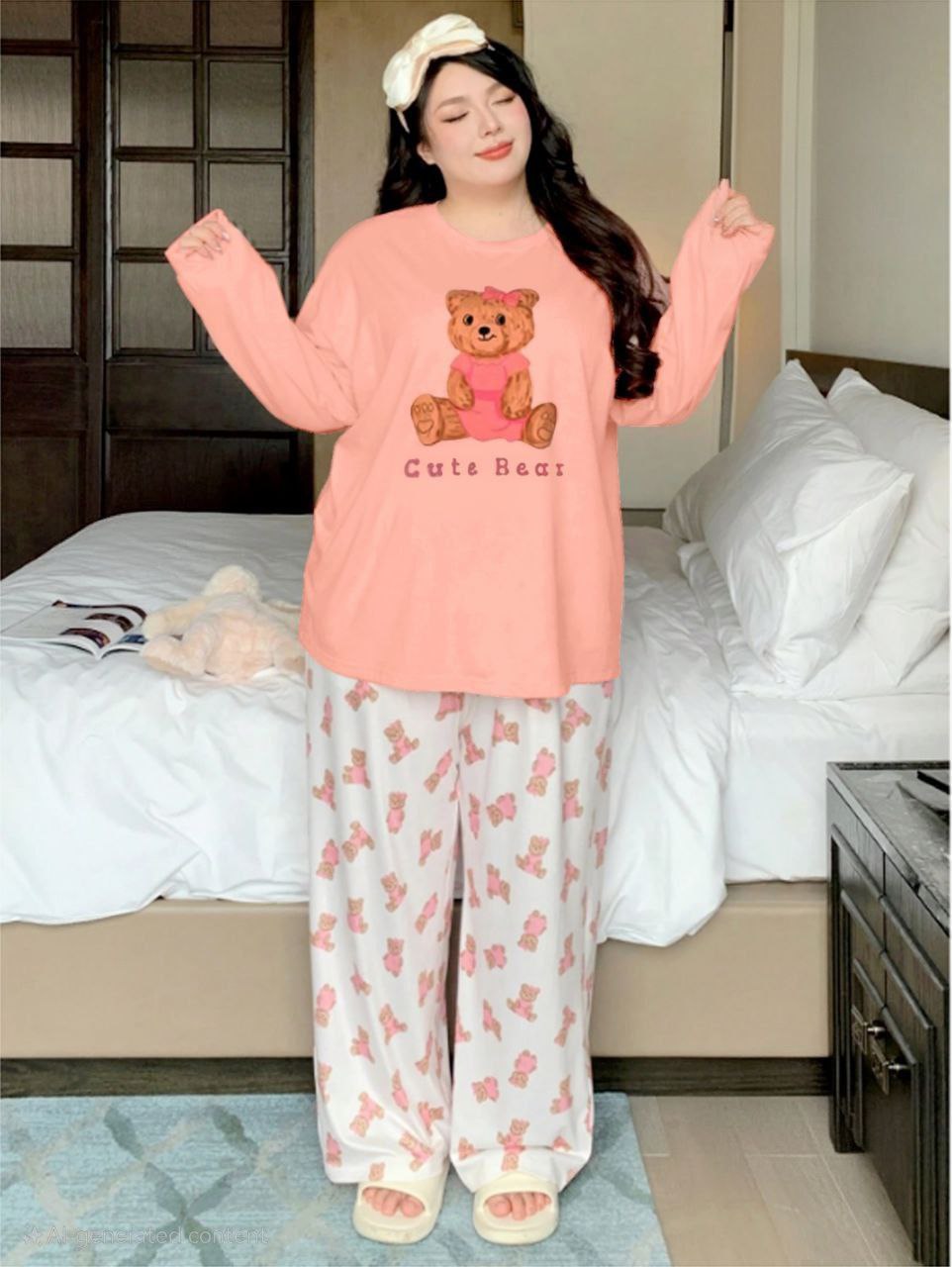 طقم بيجامة خريفي بيج سايز من إيزابيلا: تي-شيرت وردي خوخي بأكمام طويلة مطبوع Cute Bear 🧸 ومعاه بنطلون واسع أبيض برسومات دباديب كيوت بنّي/وردي.