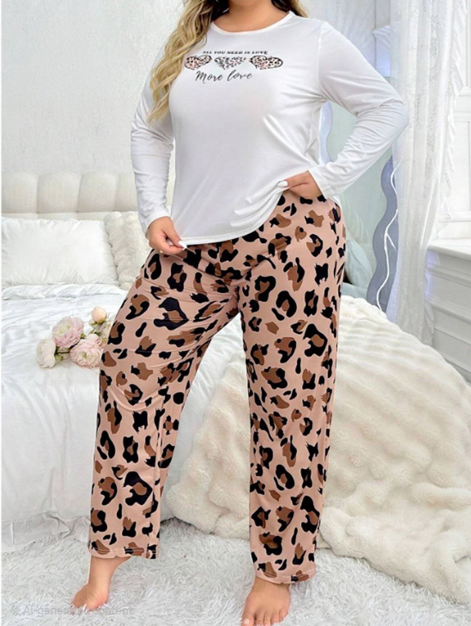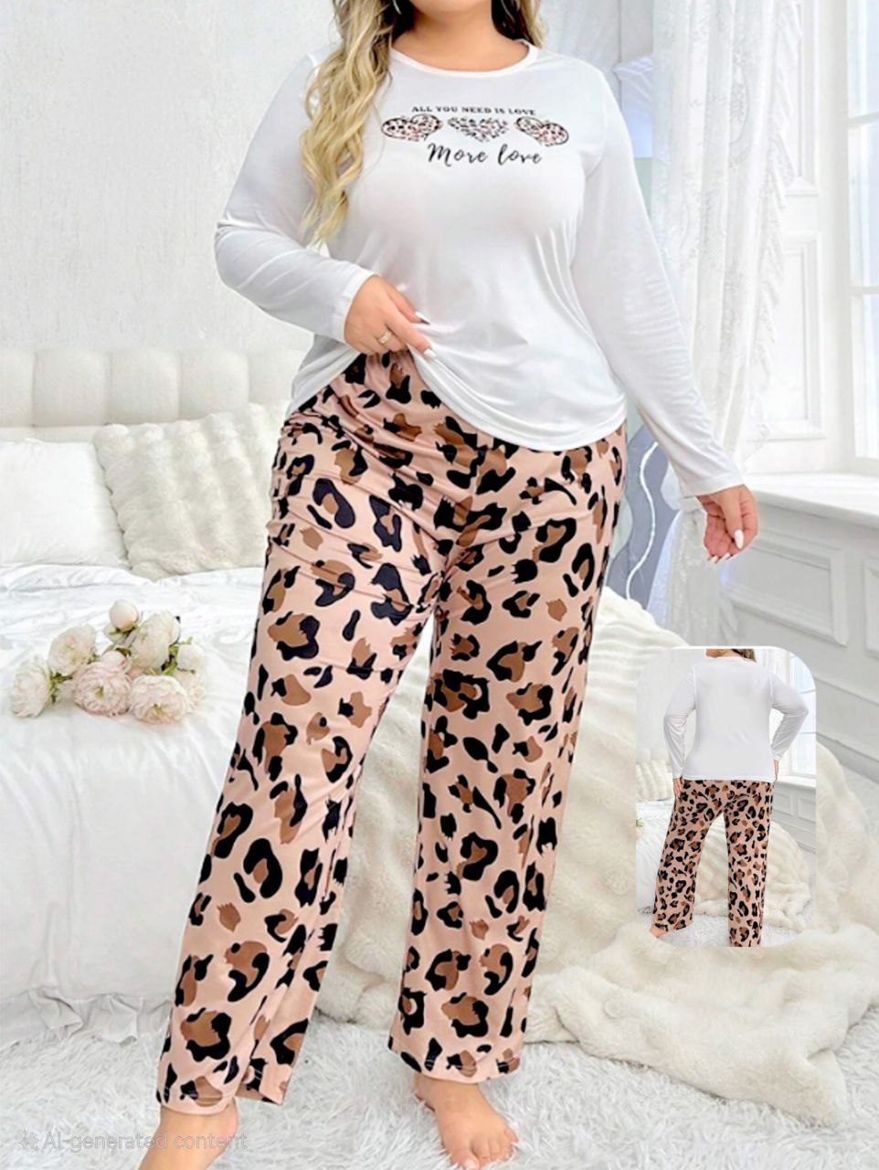 طقم بيجامة خريفي بيج سايز من إيزابيلا: تي-شيرت أبيض بأكمام طويلة مطبوع 3 قلوب ليوبارد وكلمة “More love”، ومعاه بنطلون ليوبارد واسع بلون نيود/بيج وردي 👚🤍🐆👖