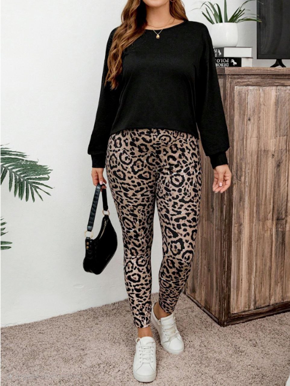 طقم بيجامة خريفي بيج سايز من إيزابيلا: تي-شيرت أسود بأكمام طويلة مع بنطلون ليجنز بنقشة ليوبارد شيك ومُلفتة 👚🐆👖