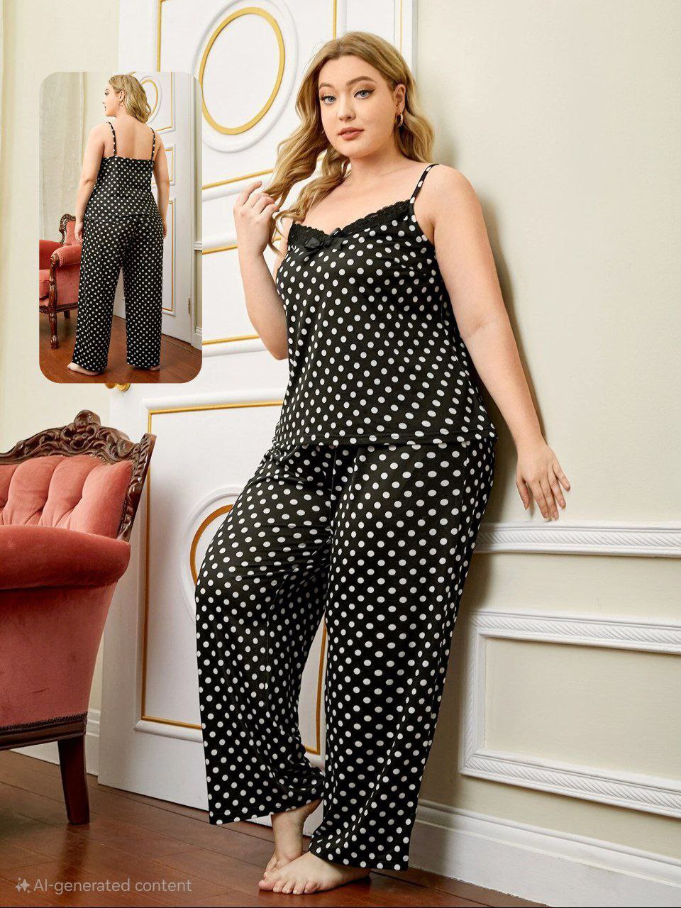 التصميم مكوّن من توب بحمالات رفيعة مزين بدانتيل أسود أنيق عند الصدر، وبنطلون واسع يديكي حرية حركة من غير ما يضغط عليكي.