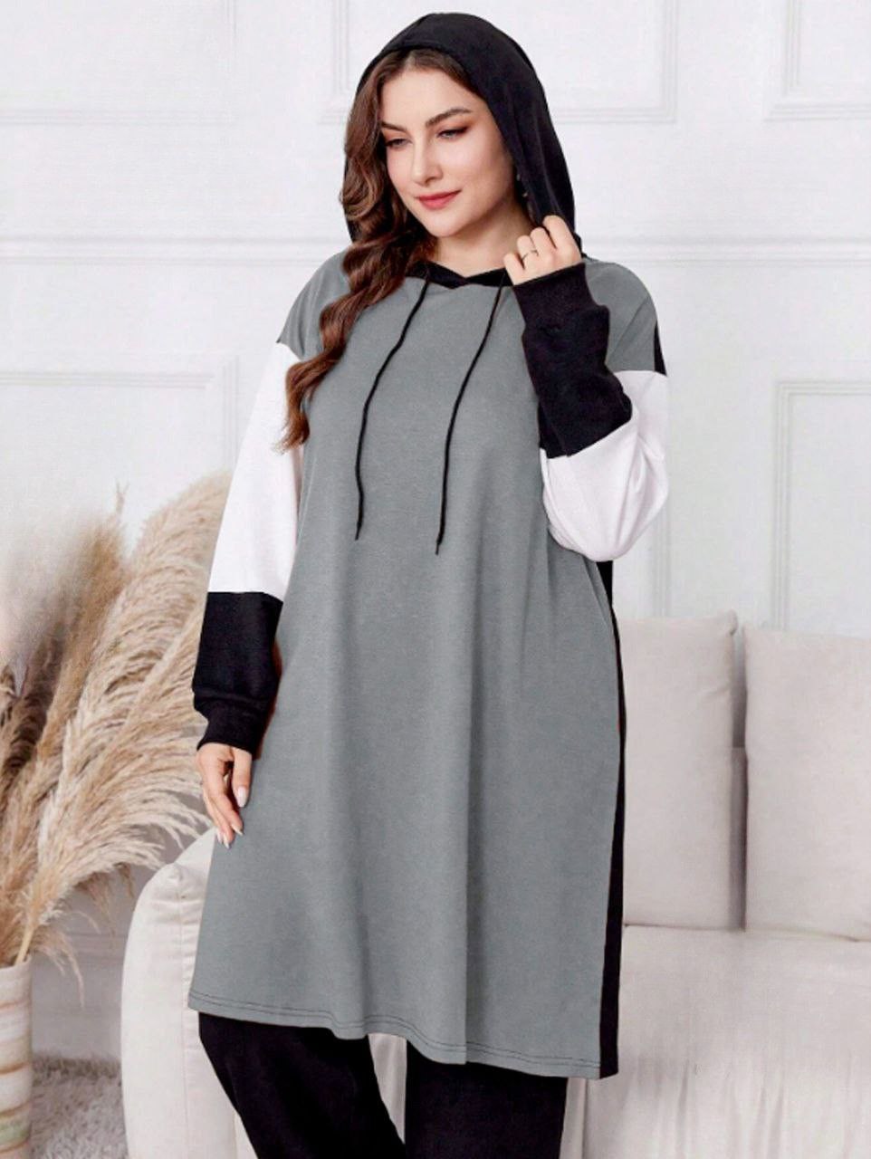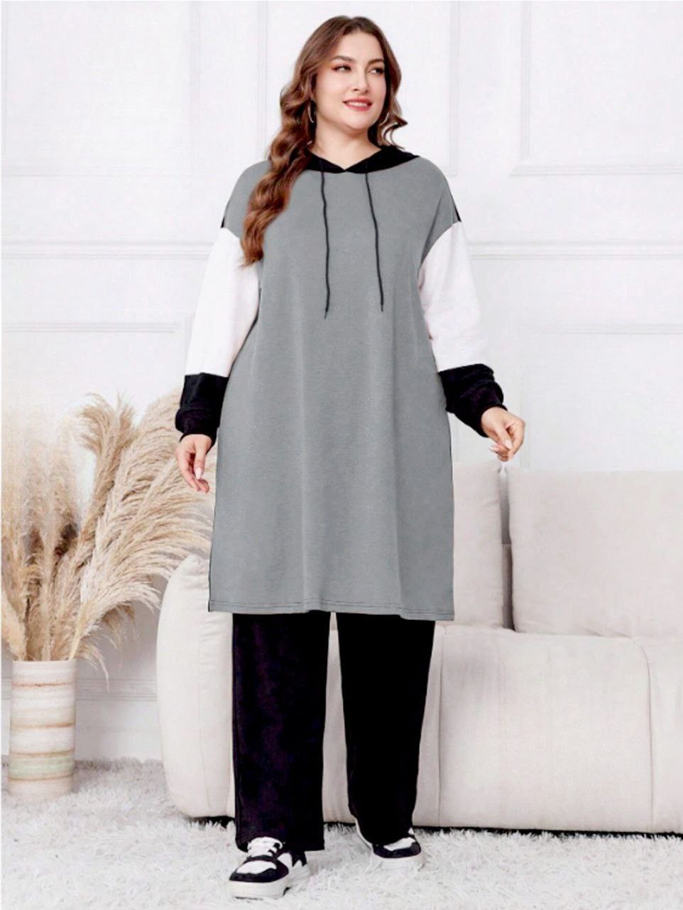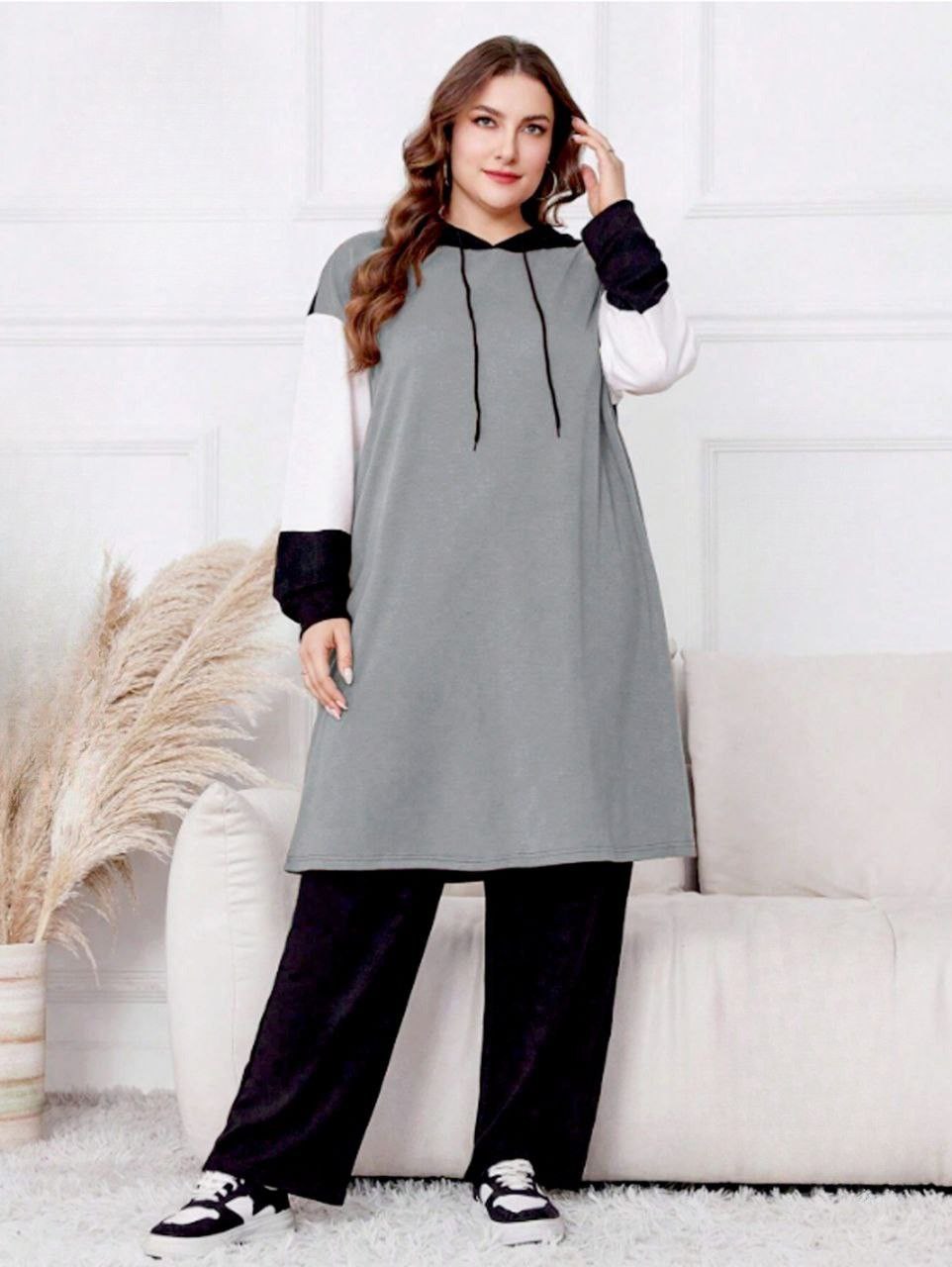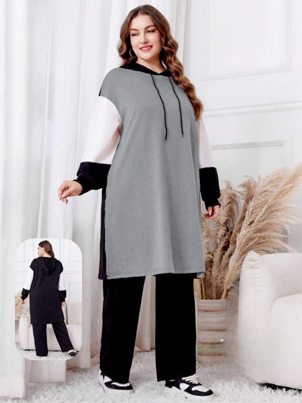 اللون/النقشة: توب رمادي مع أسود وأبيض (Color-Block) + بنطلون أسود.