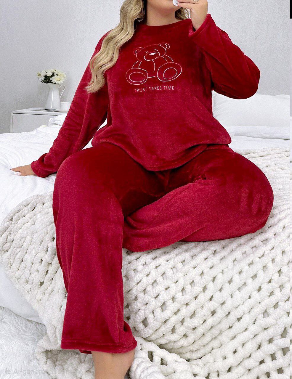 طقم بيجامة شتوي بيج سايز من إيزابيلا: بلوزة فرو سوفت برسمة تيدي مطرزة “TRUST TAKES TIME” مع بنطلون واسع مريح بوسط مطاطي. خامة ناعمة دافيه ومشبّعة، مثالية للقعدة في البيت والليالي الباردة—لوك كيوت ومريح في نفس الوقت ❄️🐻