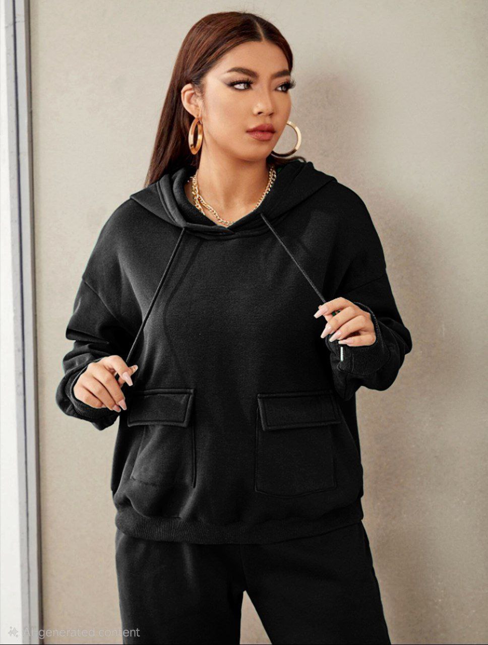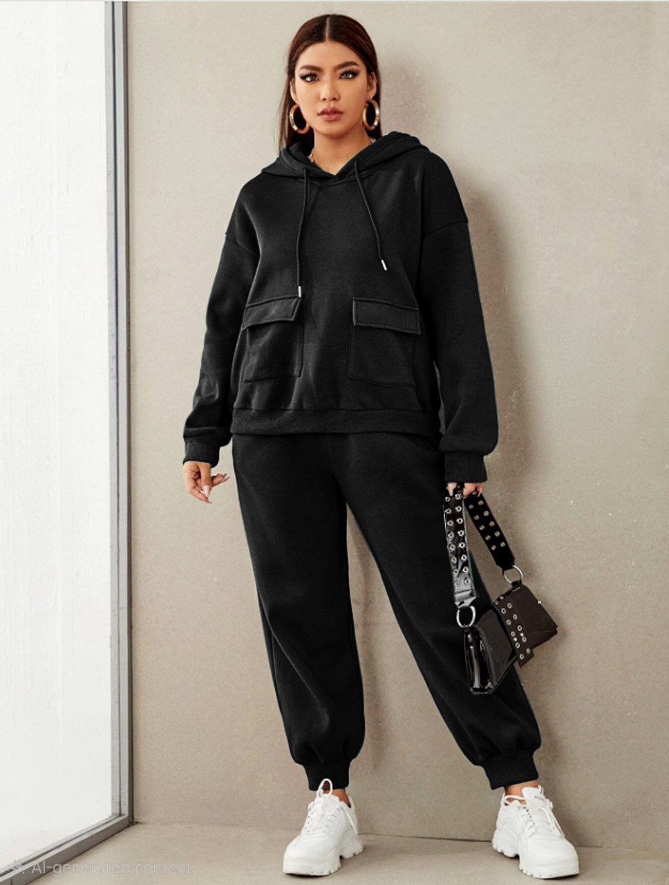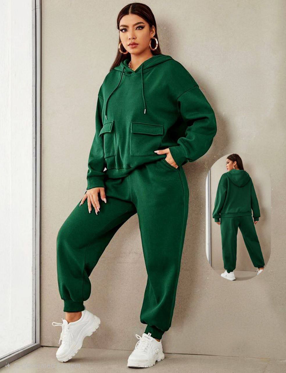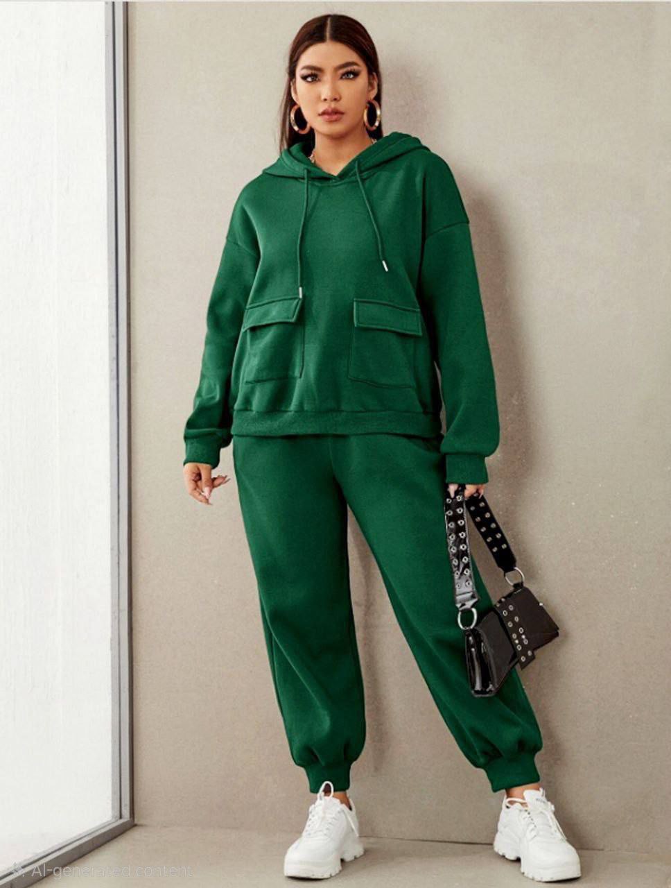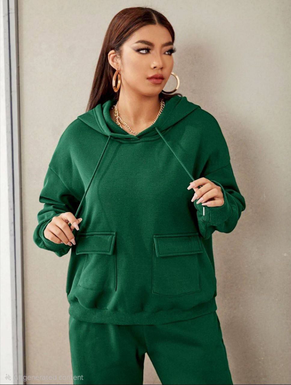 طقم لونج سِت شتوي بيج سايز من إيزابيلا: هودي أوفر سايز دافي بخامة بلوش ناعمة جدًا وجيوب أمامية بغطاء، ومعاه بنطلون ريلاكس بوسط مطاطي وضيقة على الكاحل علشان يثبت وميملاش. لوك كاجوال مريح للبيت وللسفرة السريعة—سهل اللبس ويدفي فعلًا 🔥🖤💚