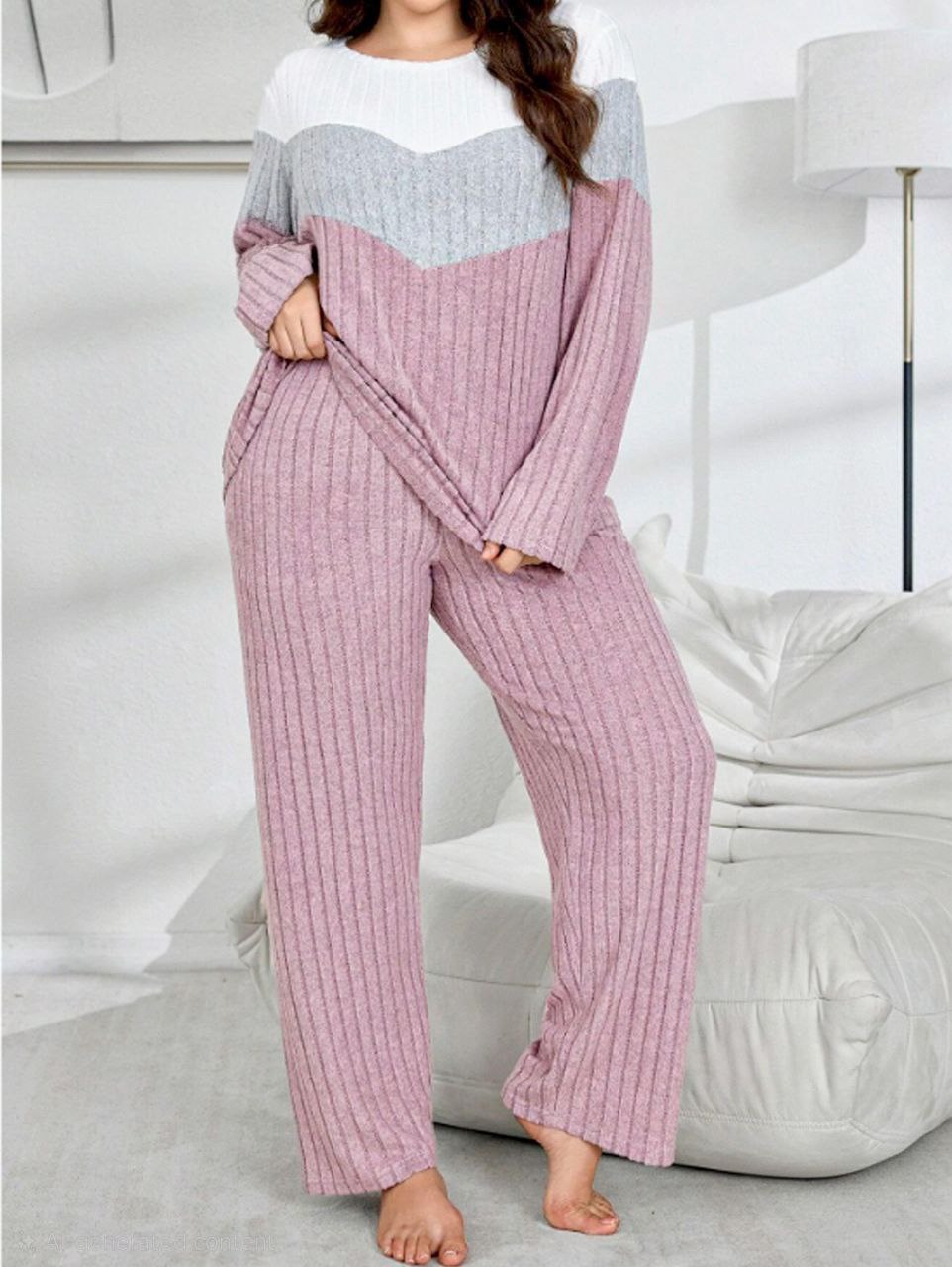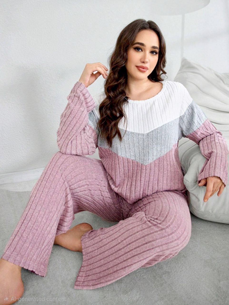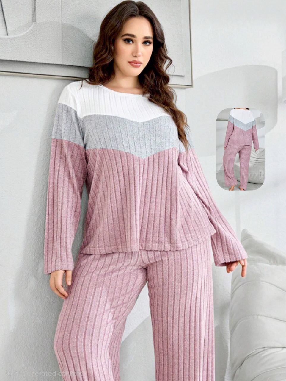 طقم لاونج/بيجامة قطيفة بيج سايز من إيزابيلا: توب بأكمام طويلة بتصميم شيفرون ألوانه أبيض × رمادي × روز موف، ومعاه بنطلون أرجل واسعة من نفس القطيفة المضلّعة… دافي، ناعم على الجلد، ومثالي للبيت والقعدة المريحة في الخريف والشتا 💖
