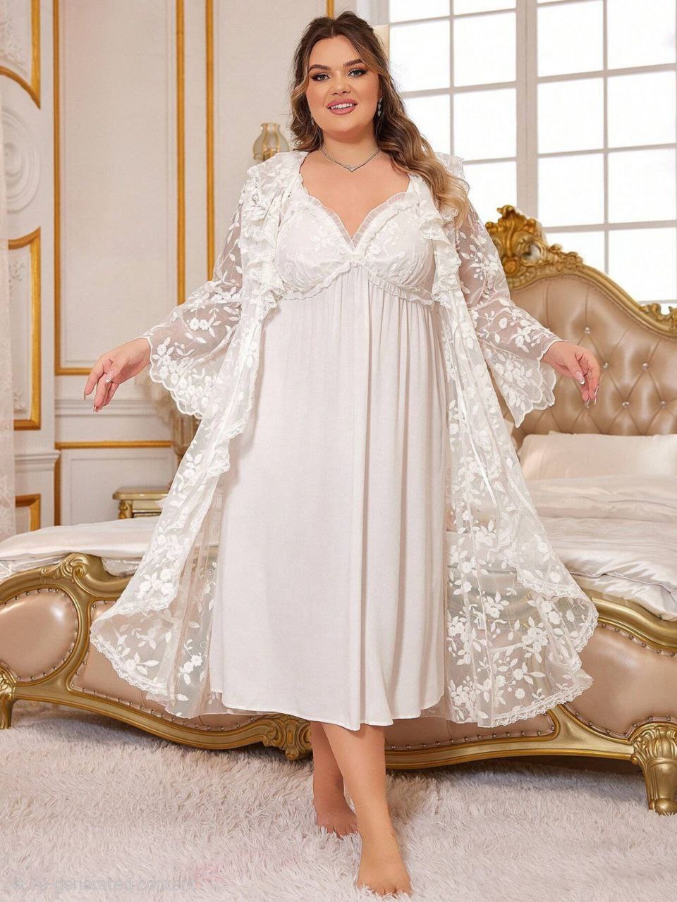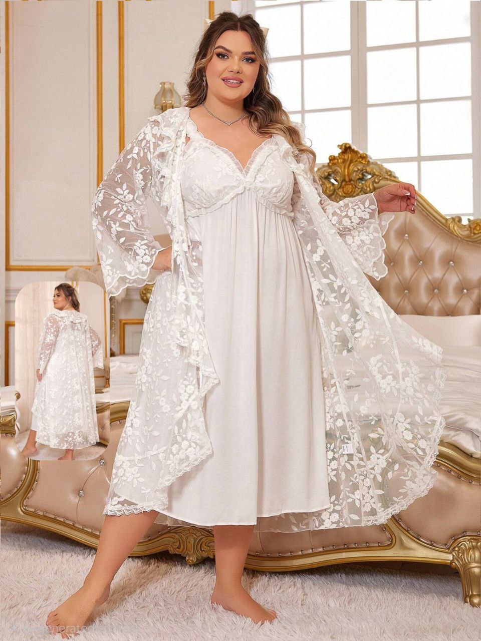 طقم لانجيري عروسي بيج سايز من إيزابيلا: قميص نوم ناعم بقَصّة ميدي مع صدريّة مزينة ورود 3D ورباطات رفيعة، ومعاه روب تل شفاف مطرّز دانتيل رقيق على الحواف 🤍✨. الخامة زِبدة ناعمة مطعّمة بدانتيل مستورد—مريحة على الجلد وتدي إحساس فخم وأنثوي.