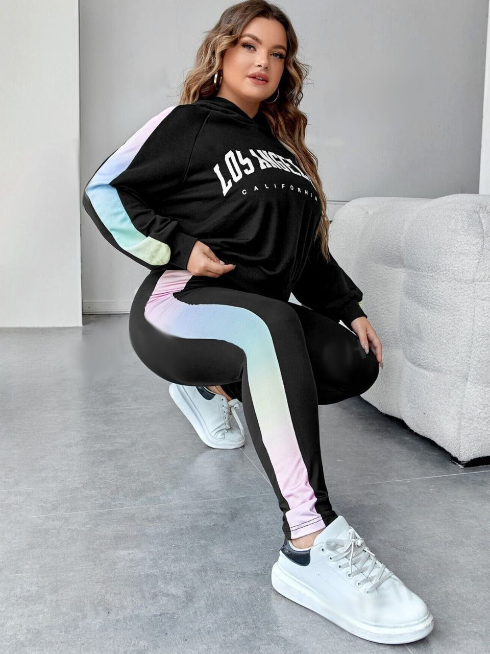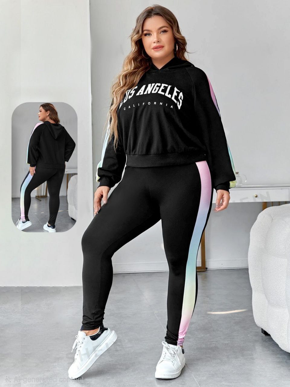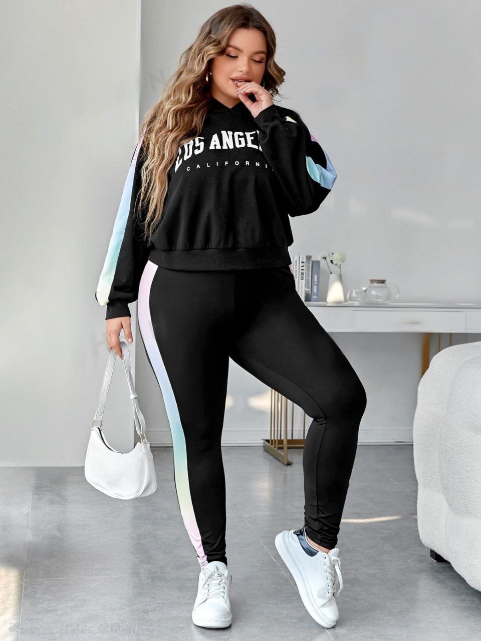 طقم لونج سيت/بيجامة خريفي بيج سايز من إيزابيلا: هودي أسود مطبوع LOS ANGELES CALIFORNIA بأكمام وبنطلون سليم بجوانب جRADIENT باستيل ناعمة… لوك سبورتي-شيك مريح للبيت والمشاوير الخفيفة 🖤🌈