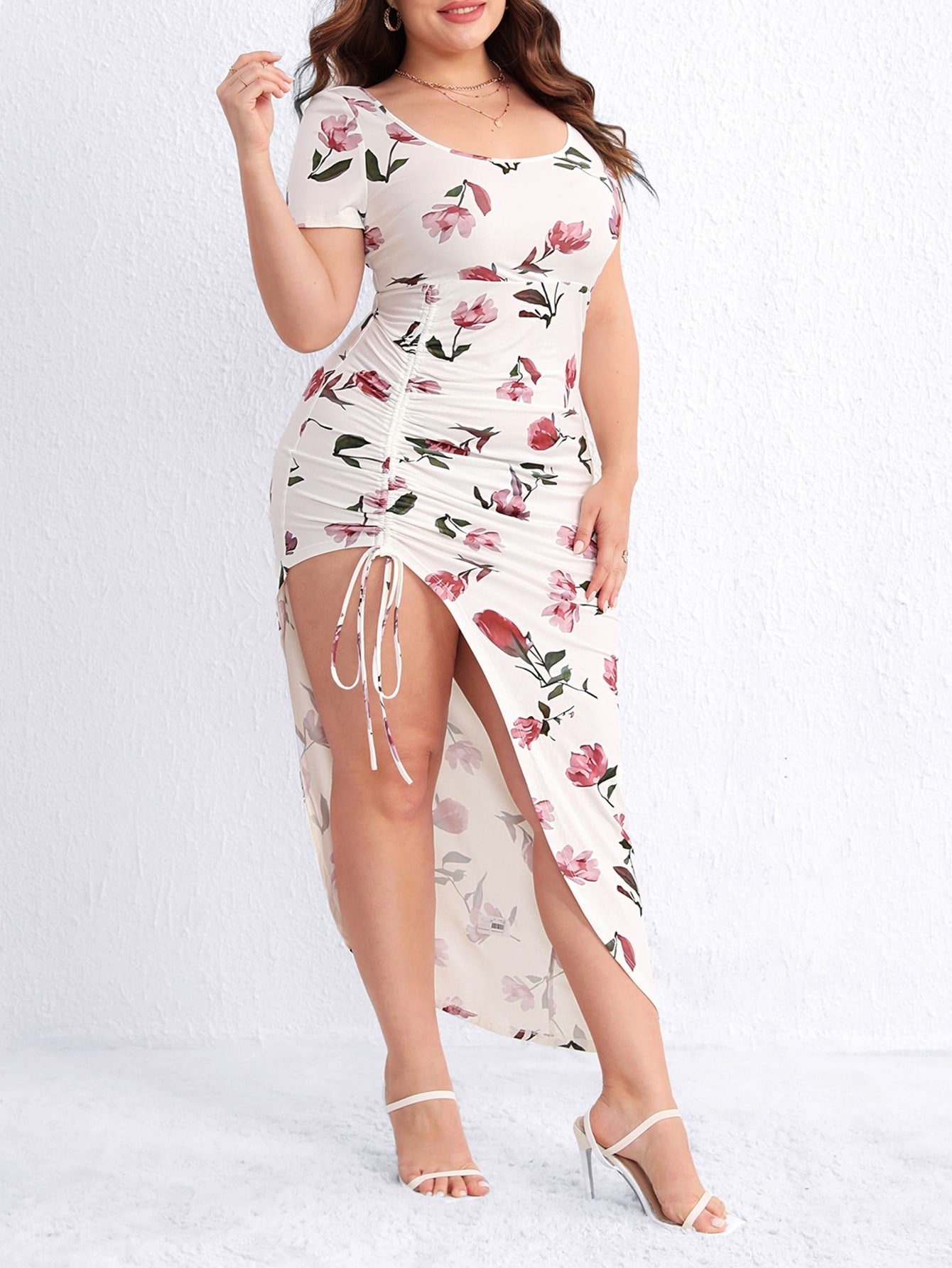 فتحة رقبة مستديرة أنثوية، وأكمام قصيرة مريحة، مع رباط شد على الجنب وشق عالي شيك يدي طول للساق ويحلي شكل الرجل. مناسب للبيت، الخروجات الخفيفة، والسهرات الكاجوال للبنات البيج سايز اللي بتحب الفساتين المريحة والأنثوية في نفس الوقت.