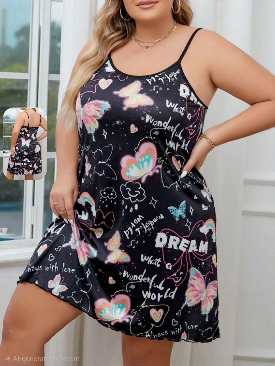 كاش حمالة بيج سايز من إيزابيلا بلون أسود شيك وطباعة فراشات وأشكال قلوب وكلمات لطيفة زي DREAM و Wonderful World… موديل بناتي جدًا ومبهج، قصّة ميدي فوق الركبة بتدي وسع مريح من غير ما يحدد الجسم، وحمالات رفيعة مناسبة لجو الصيف في البيت.
