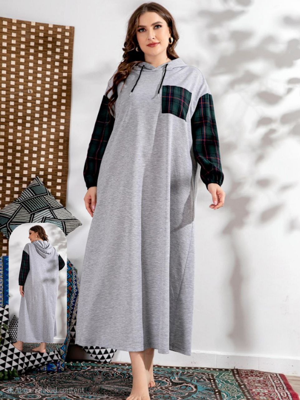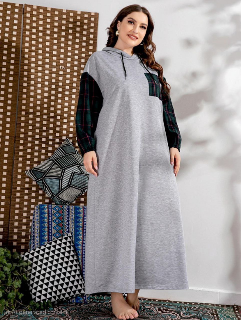 كاش بيج سايز عملي من إيزابيلا بقصّة واسعة ماكسي، خامة سمر ميلتون ناعمة ومريحة للبيت والمشاوير السريعة. الجزء الأساسي رمادي مع هودي بخيطان، وأكمام وجيب صدر كاروهات بيدّوا لوك شبابي عصري. خفيف، مش مبين التفاصيل، ومثالي للخريف/الجو المعتدل.