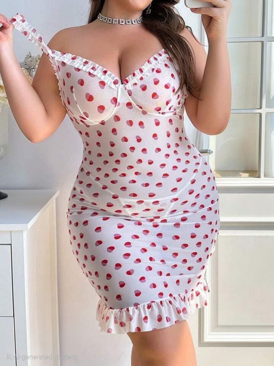 🎨 اللون: أبيض مطبوع بولكا دوتس أحمر مع كشكشة بنفس اللون.
