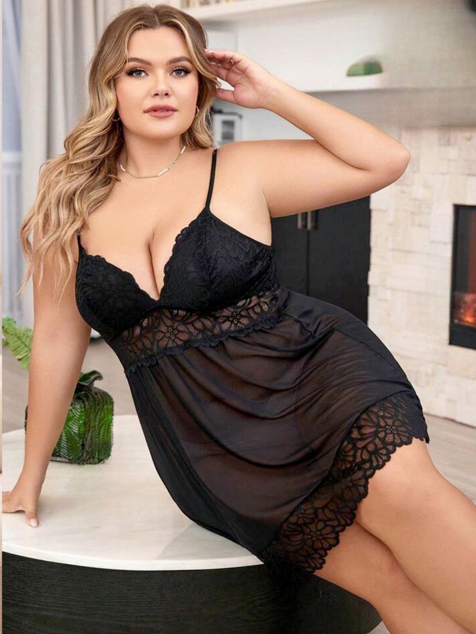 لانجيري بيج سايز من إيزابيلا: بيبي دول أسود شيك بصدّار دانتيل ناعم وتطعيم دانتيل حوالين الوسط، مع تنورة شيفون شفّافة خفيفة بتدي فلو أنثوي وحركة لطيفة. حمالات رفيعة ولمسة دانتيل على الذيل تكمل اللوك الرومانسي الجذّاب. مثالي لليالي المميّزة والستايل الأنيق في البيت. 🖤