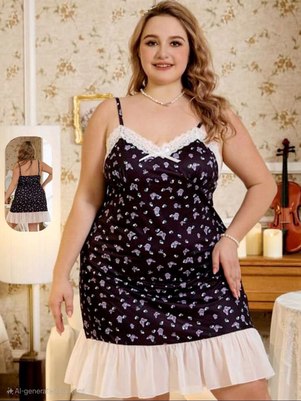 إيزابيلا – فستان بيج سايز قصير مطبوع بدانتيل أبيض وخامة زبدة مستوردة