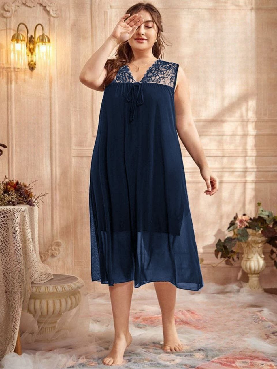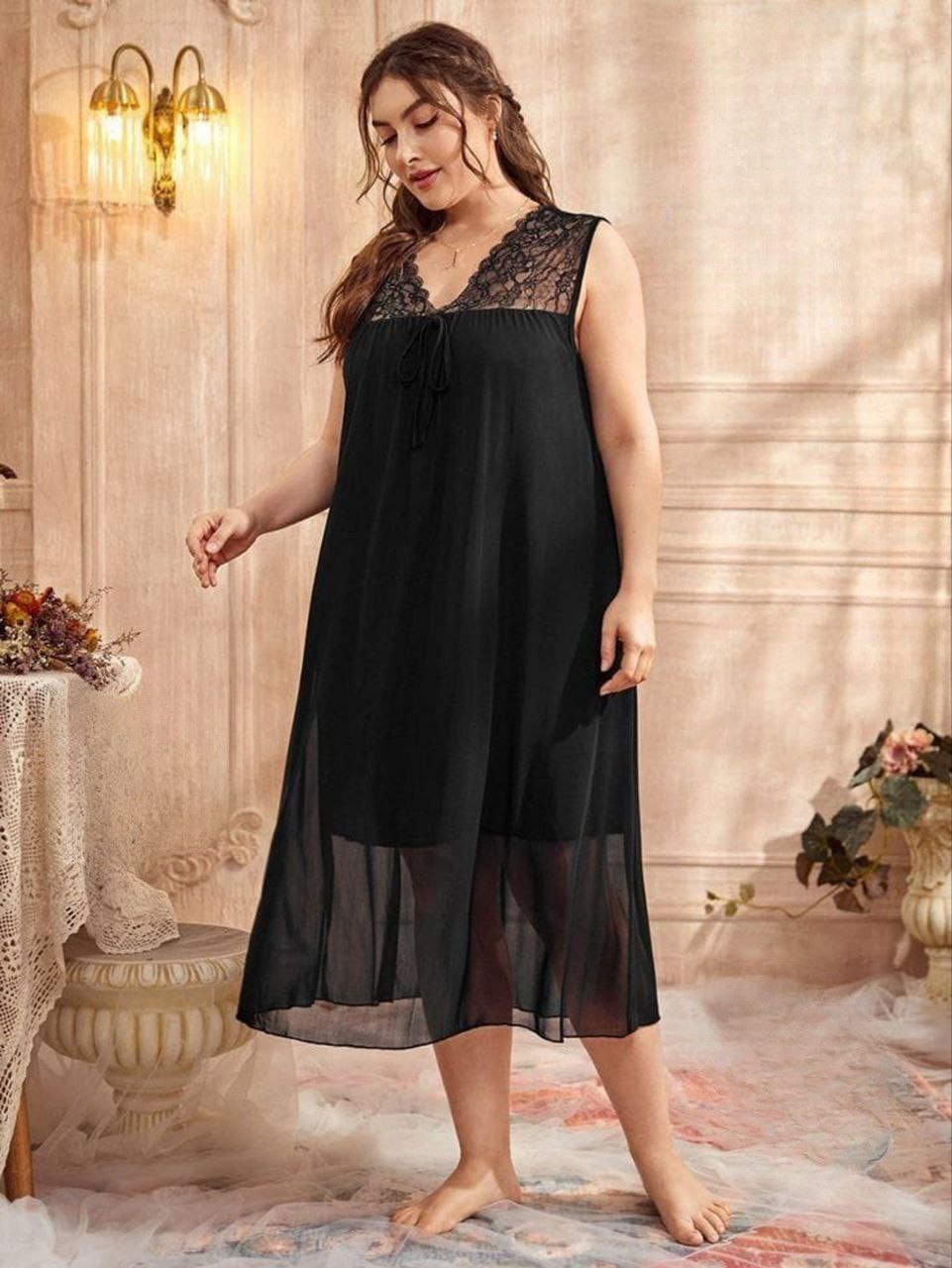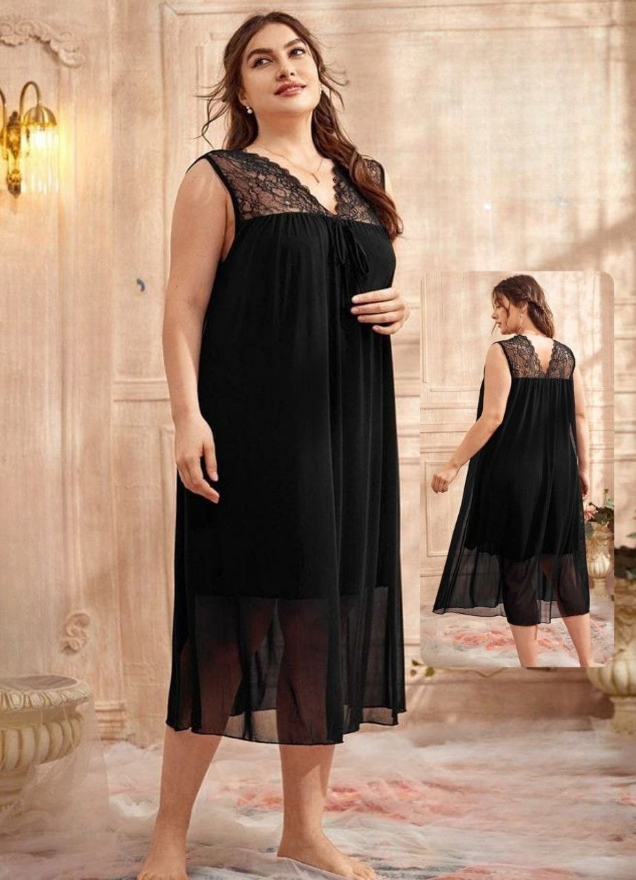 لانجيري ميدي مريح من إيزابيلا بخامة زِبده ناعمة وباردة على الجلد، مع ياقه V ودانتيل تلّ شِيك من قدّام ولورا يدي لمسة أنثوية رقيقة من غير ما يشفّ. القصّة واسعة بتنزل بانسيابية عشان تلبيس مريح لحدود 110 كجم—مثالي لسهرة هادية ونوم أريح في الصيف والشتا. 🌙
