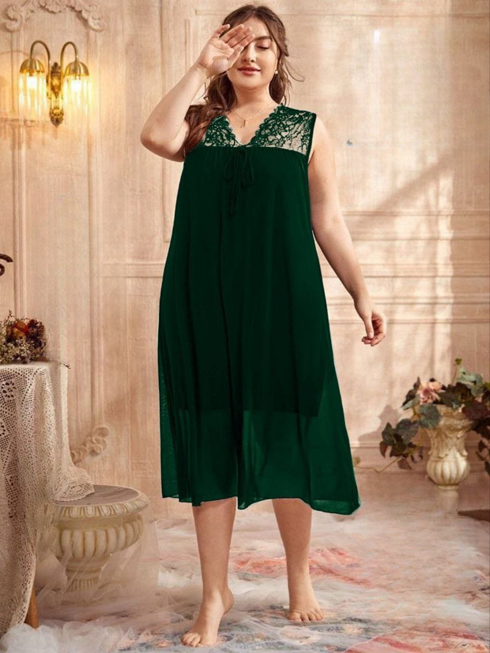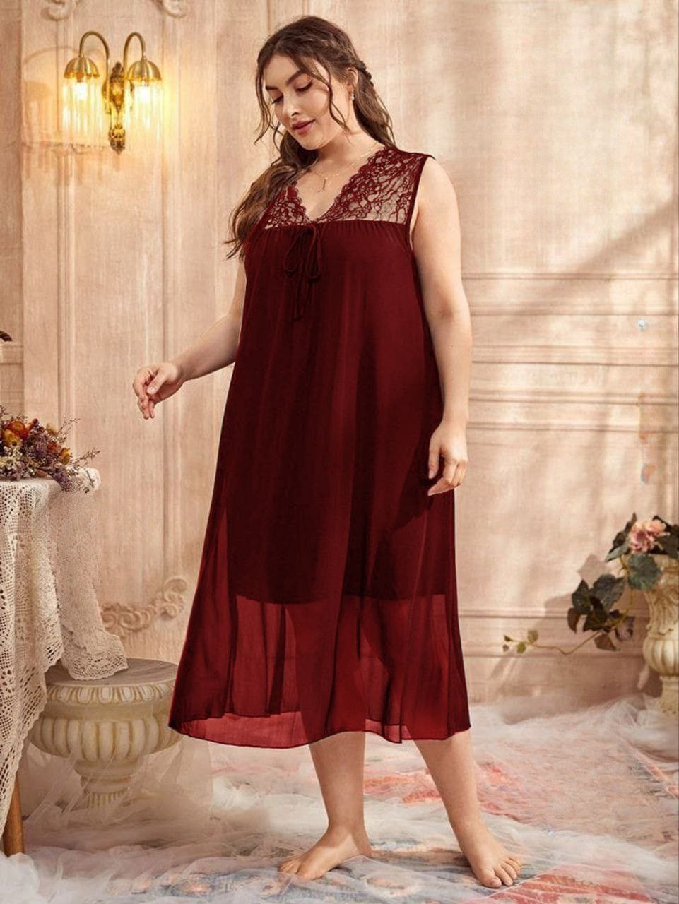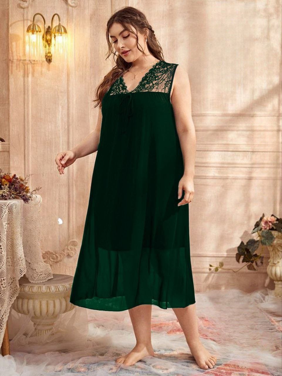 لانجيري ميدي مريح من إيزابيلا بخامة زِبده ناعمة وباردة على الجلد، مع ياقه V ودانتيل تلّ شِيك من قدّام ولورا يدي لمسة أنثوية رقيقة من غير ما يشفّ. القصّة واسعة بتنزل بانسيابية عشان تلبيس مريح لحدود 110 كجم—مثالي لسهرة هادية ونوم أريح في الصيف والشتا. 🌙