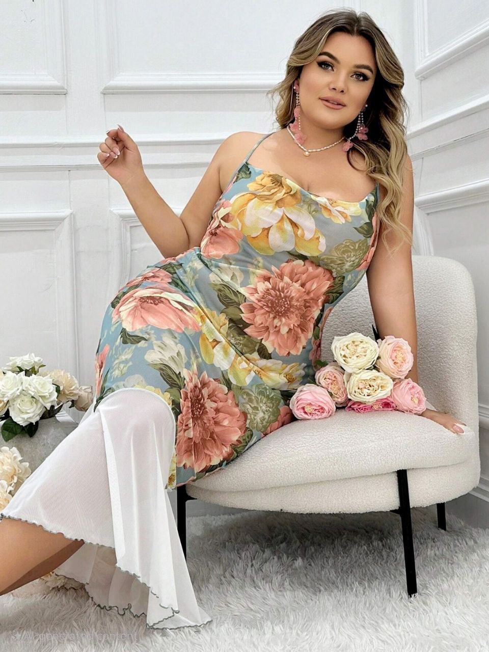 إيزابيلا – لانجيري فلوري طويل بيج سايز بحمالات رفيعة وذيل شيفون مموّج