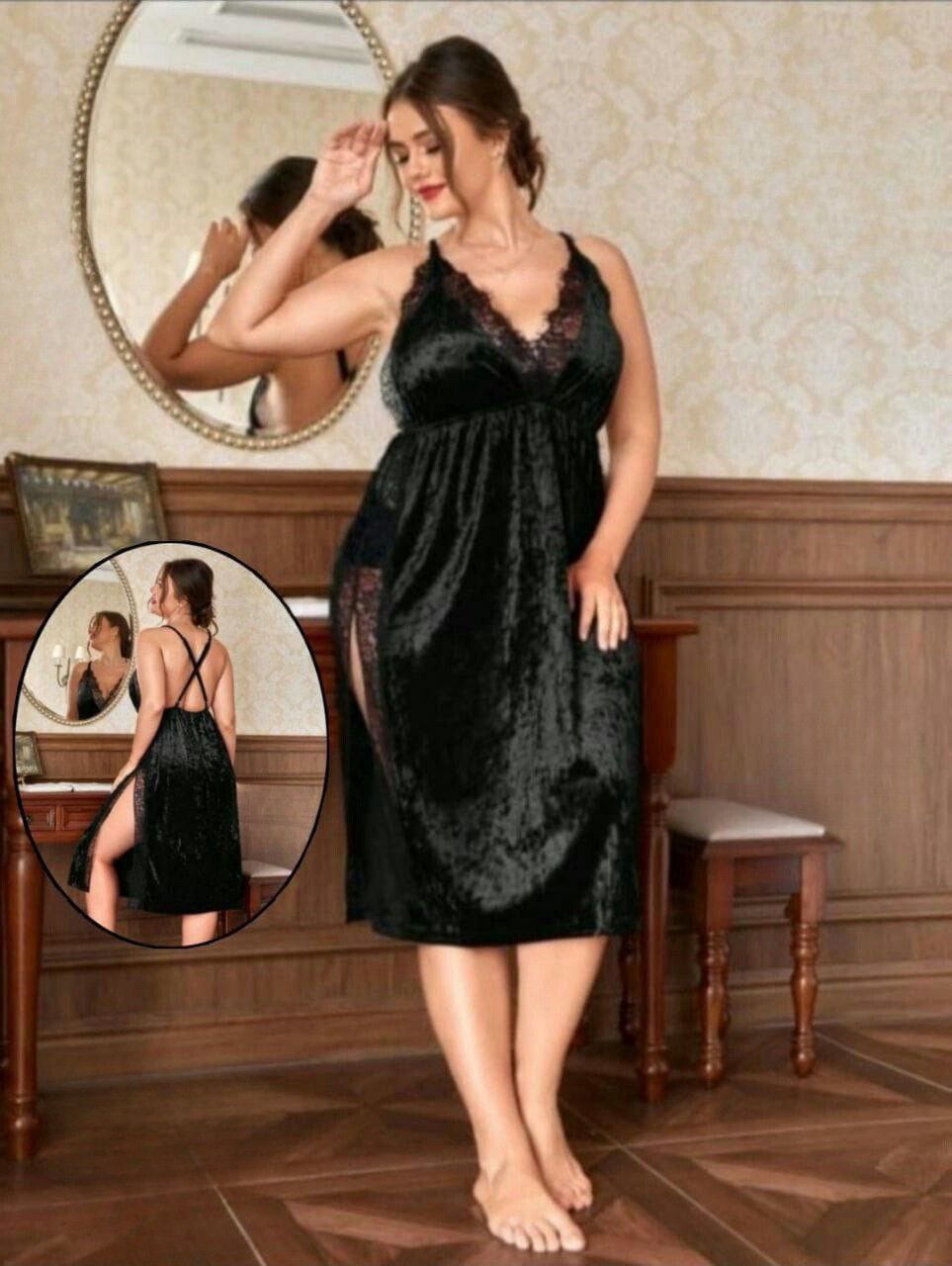 إيزابيلا – لانجيري قطيفة -كرستال- بيج سايز بدانتيل أسود وشق جانبي