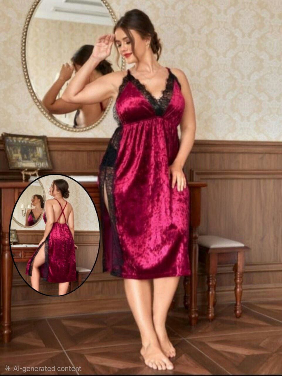 لانجيري قطيفة كرستال بيج سايز من إيزابيلا بلون نبيتي فخم، بحواف دانتيل أسود على الرقبة والفتحة الجانبية لستايل أنثوي رايق. قصة ميدي مريحة بحمالات رفيعة متقاطعة من الظهر وتضبيط مريح تحت الصدر علشان يدي قوام ممشوق ويحافظ على الراحة طول الليل ✨