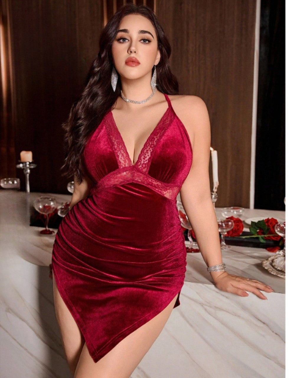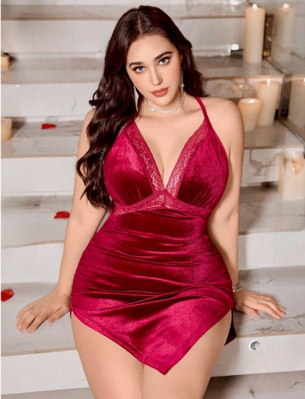لانجيري قطيفة نبيتي بأنوثة ملفتة وتلبيس مريح للبيج سايز. قصّة V مع لمسة دانتيل شيك بتدي تحديد بسيط للصدر والخصر، وتكسيرات جانبية بتخلي اللبس واقع حلو على الجسم. الظهر كروس باك شكله رقيق، والطول قصير بفتحة مائلة عشان حركة أسهل وإطلالة أشيك. مناسب للبيت واللِّيالي الخاصة، وخامته قطيفة هايدي مستوردة ناعمة على البشرة ومش “بتقرِّص”.
