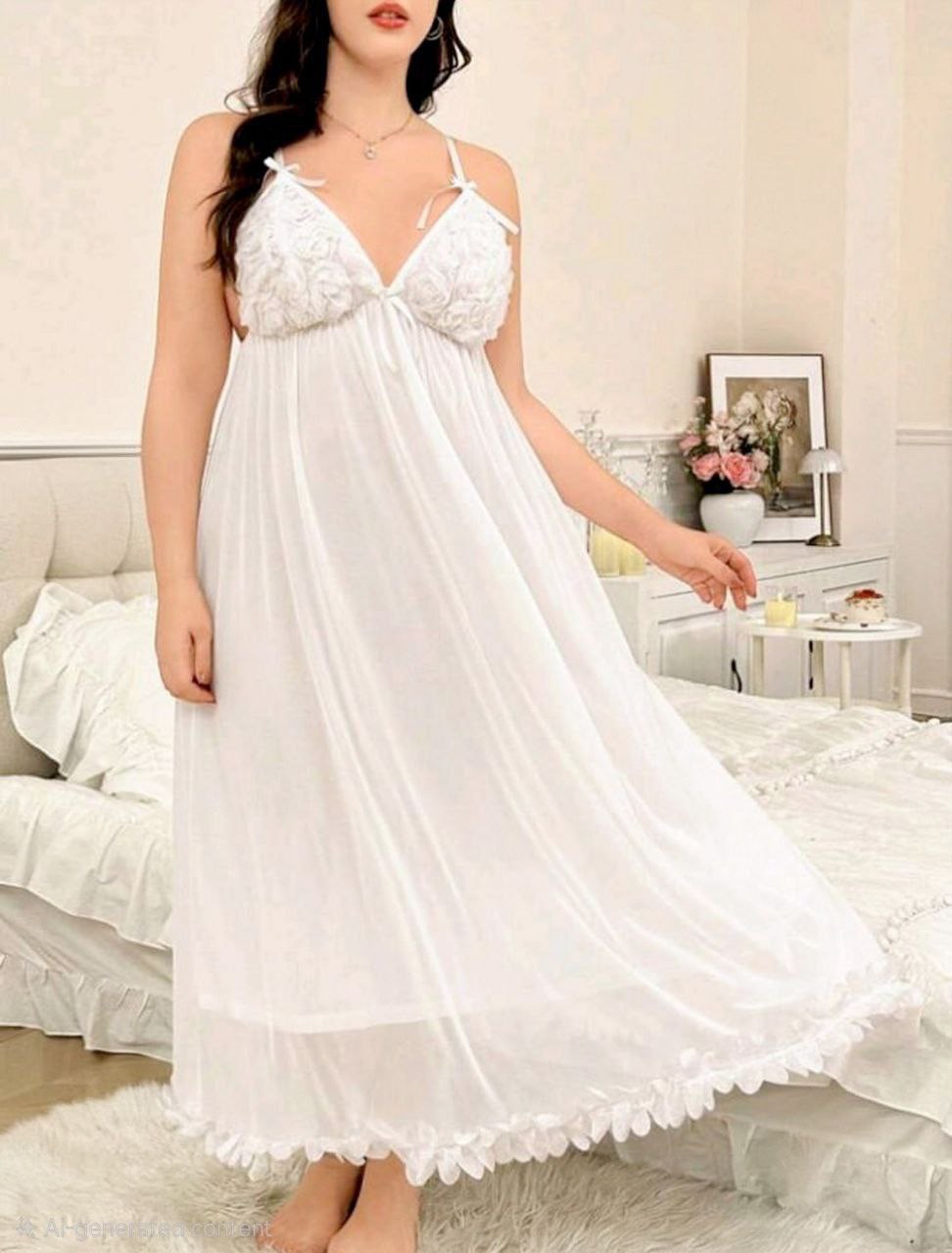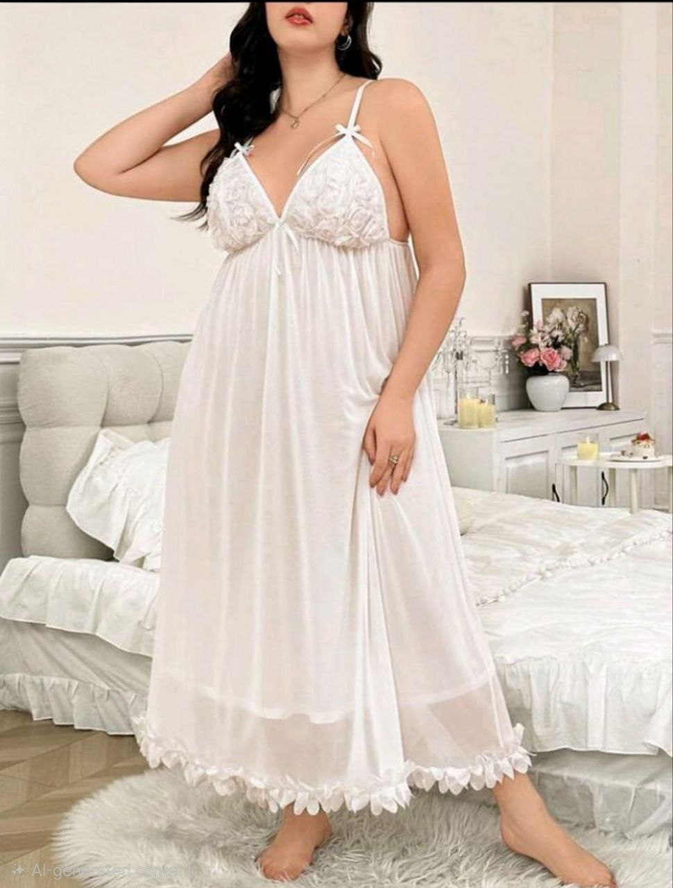 لانجيري قميص نوم بيج سايز من إيزابيلا بلون أبيض ناعم. الصدر مزوّد بزهور 3D ودانتيل رقيق، مع تفصيلة ظهر على شكل فراشة تديك لمسة أنثوية مميّزة. القماش تُل مستورد مبطّن بزبده ناعمة علشان إحساس خفيف ومُريح على الجسم – مناسب للصيف والليالي الهادية أو تجهيزات العروسة.