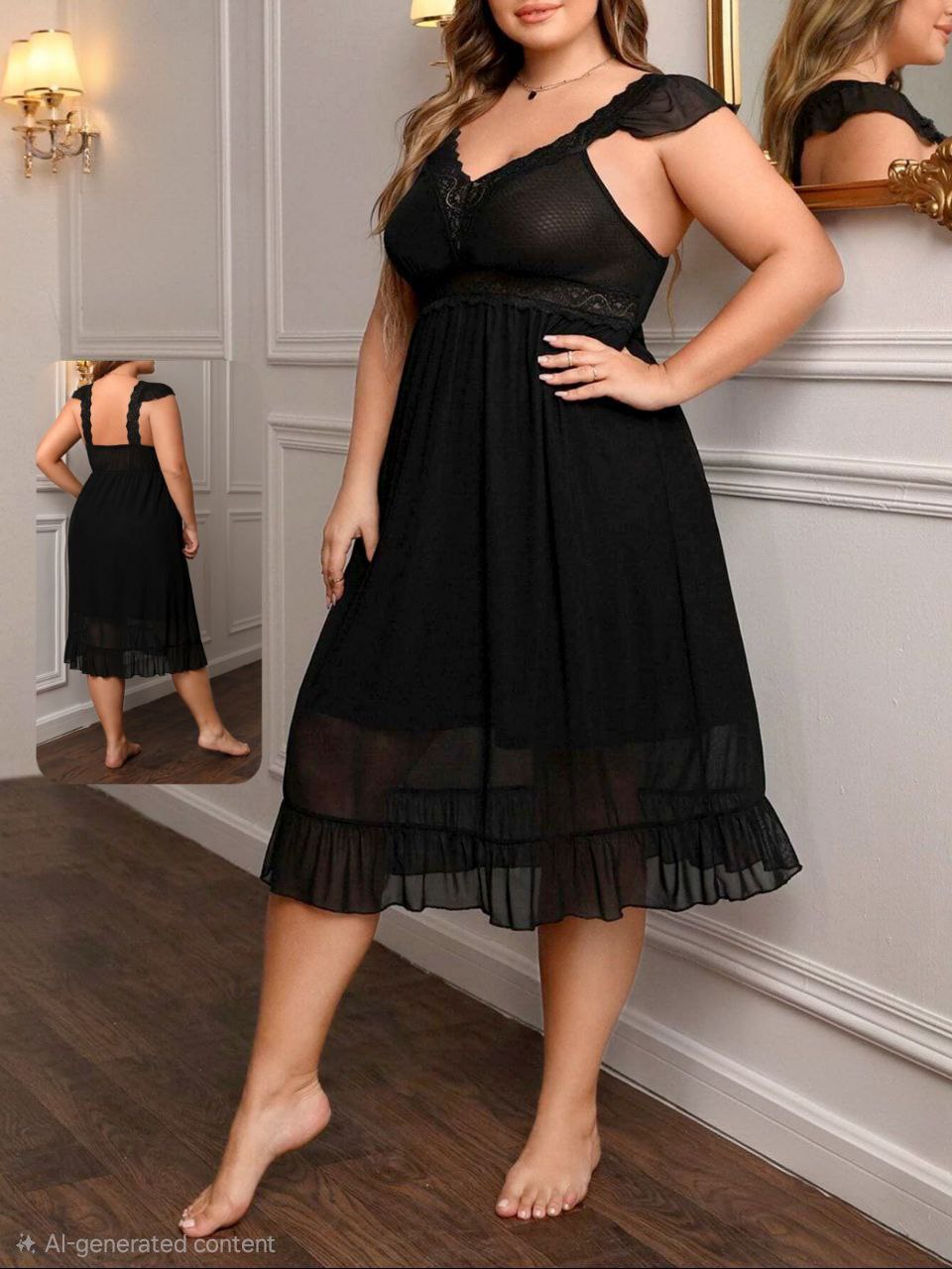 لانجيري ميدي بيج سايز من إيزابيلا: فستان نوم أسود بدانتيل رقيق من الأعلى، بحمّالات واسعة بفَرِل ناعم وكشكشة خفيفة على الديل، ومبطن بطبقة زِبده ناعمة عشان الراحة والستر من غير ما يعضّل 👗🖤